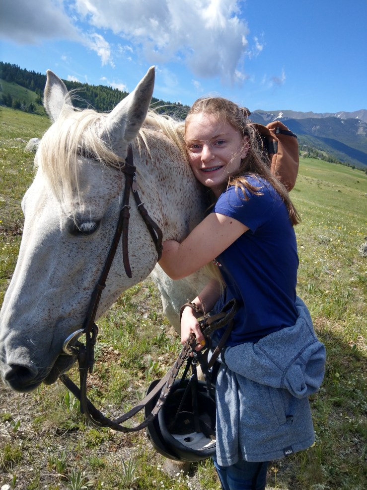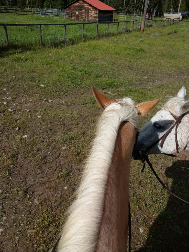 Das Eigentliche auf der Ranch war aber natürlich die Pferde und das Reiten. Die rund 60 Pferde sind nachts auf einer gewaltigen Koppel am Bach und tagsüber werden sie je nach Temperament den jeweiligen Reitern zugeordnet. Ich hatte das sehr sanfte, bisschen nervöse Pferd „Blondie“ das einen sehr gemächlichen Galopp (jawoll) hatte. Sophie hatte das Pferd der Besitzerstochter, das diese als 11jährige geritten hat und das wiederum sehr gerne trabte und galoppierte. Nach dem ersten Ausritt gingen wir Eltern wie John Wayne zu unserer Hütte und konnten uns kaum rühren, während die Kinder behaupteten „nix“ zu spüren. Super, wenn man so langsam ins Senioren Alter kommt. Abends sagte man also Bescheid was man am nächsten Tag so an Reitaktivtät haben wollte und nach dem Frühstück ging es dann in den Sattel und wir sind dann meist als Familie mit einem „Wrangler“ irgendwo auf dem unendlichen Farmareal über Wiesen, durch Wälder usw. geritten. Grad schee wars (Abgesehen von den Beinen, dem Rücken, den Armen usw).